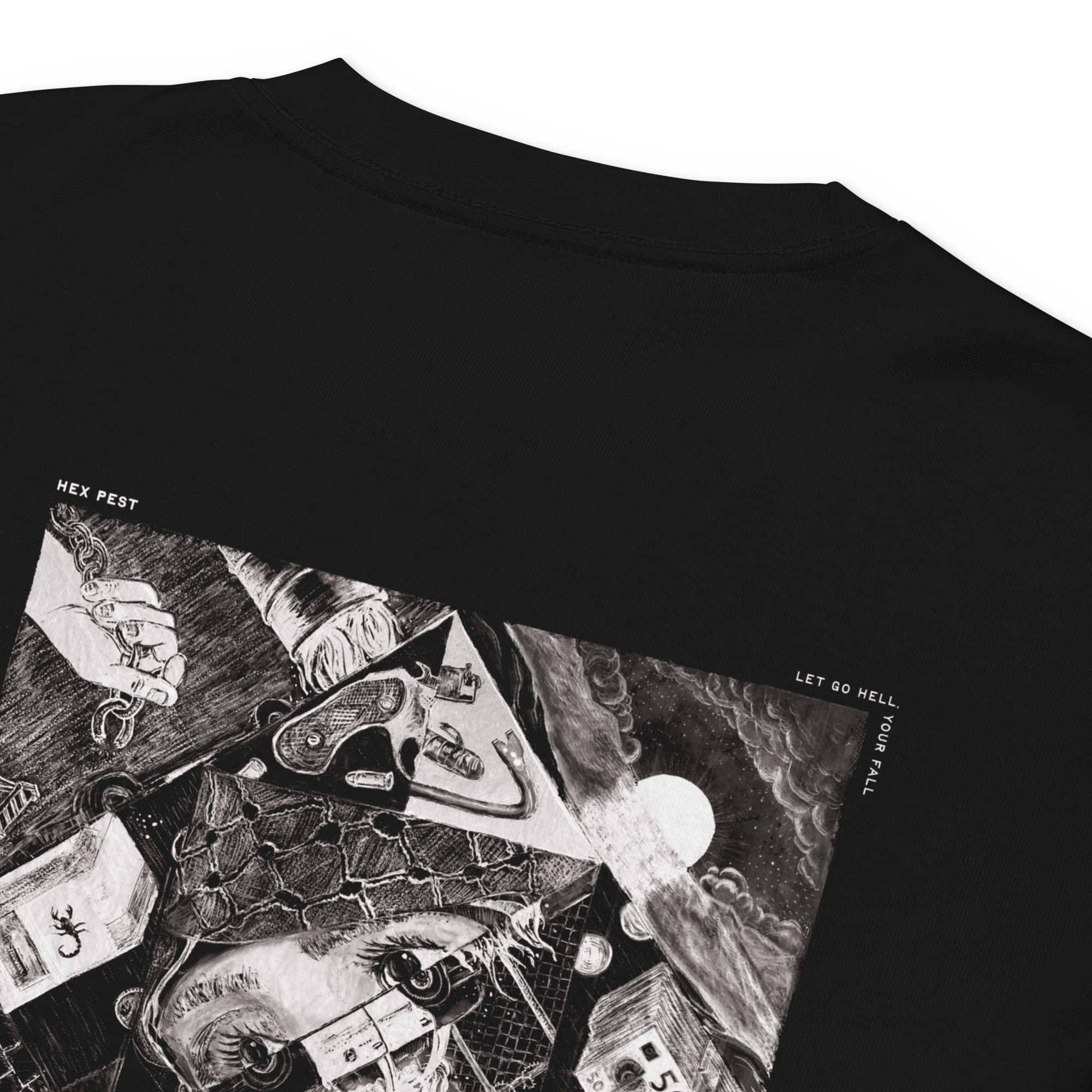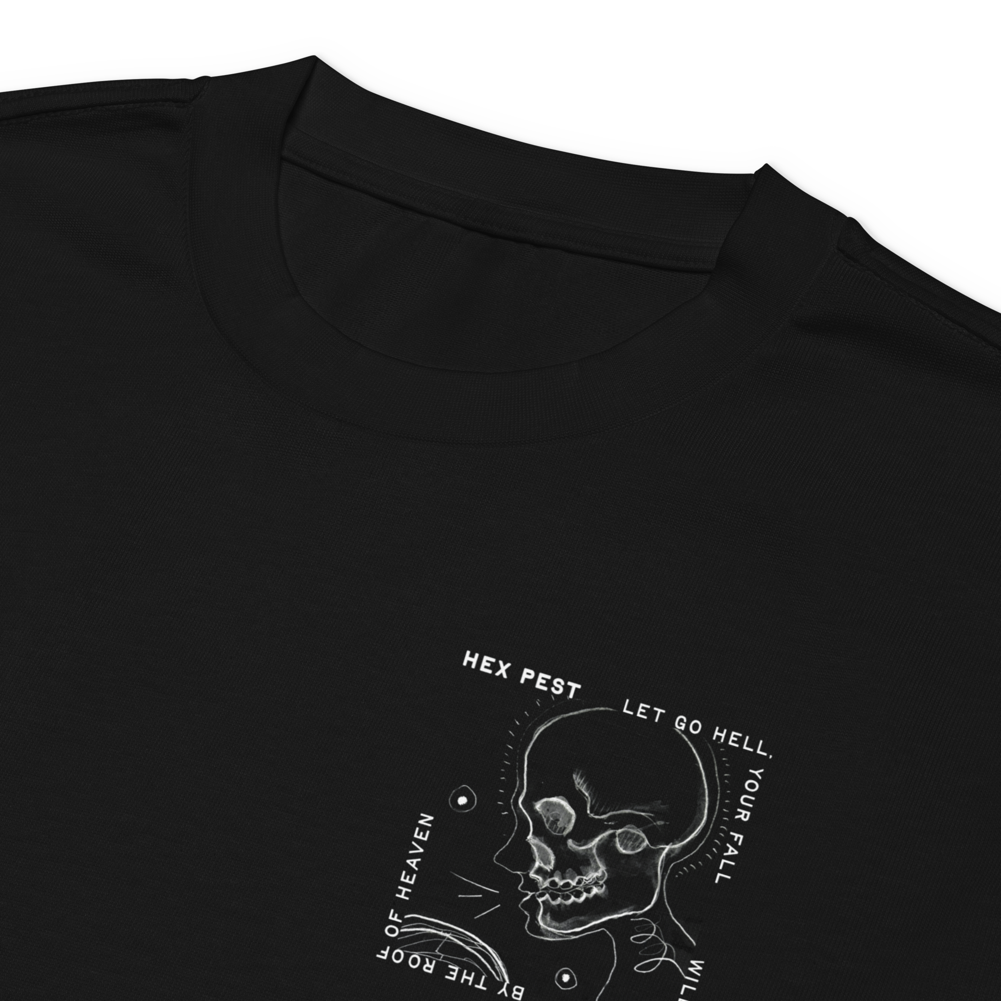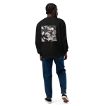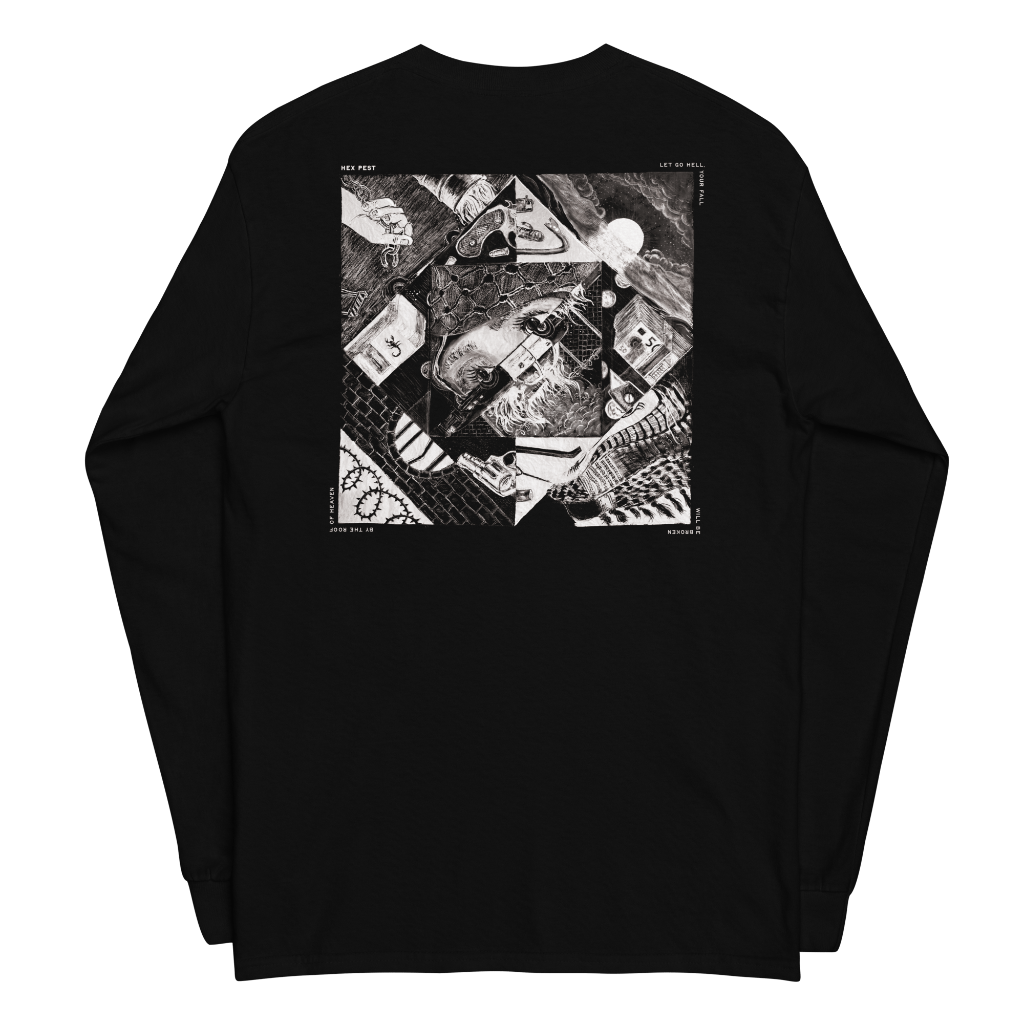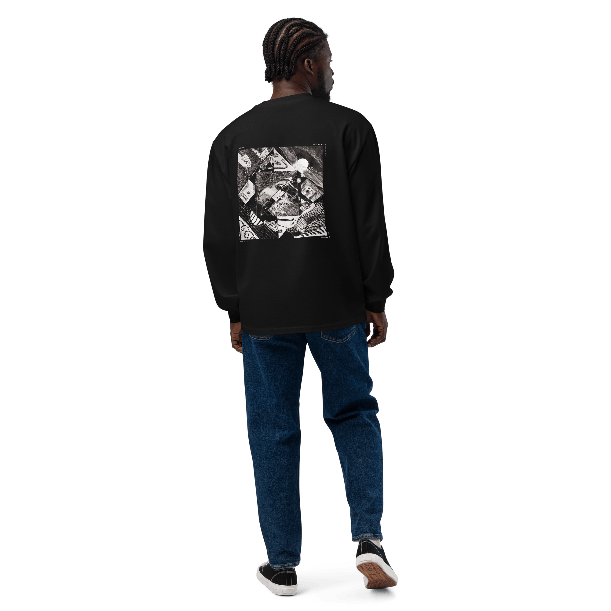 Premium Heavyweight Black 100% Cotton long sleeve garment, skull design front pocket print with full size LGHYFWBBBTROH print reverse